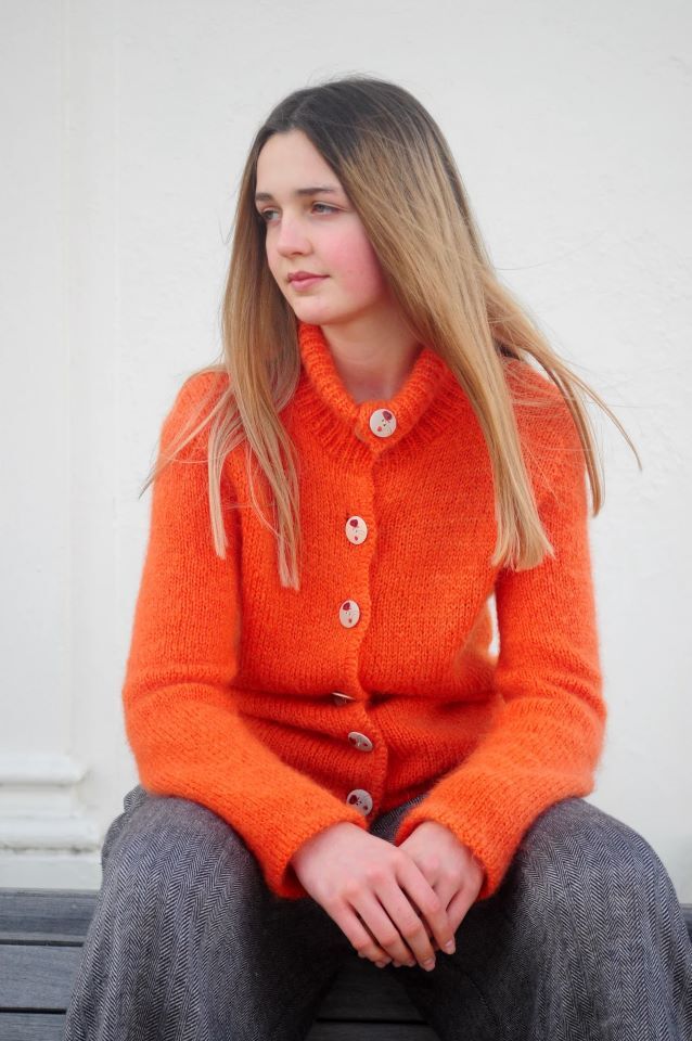 Touch mohair jacket style in orange and cardigan style with the neckband left up and not sewn down in charcoal