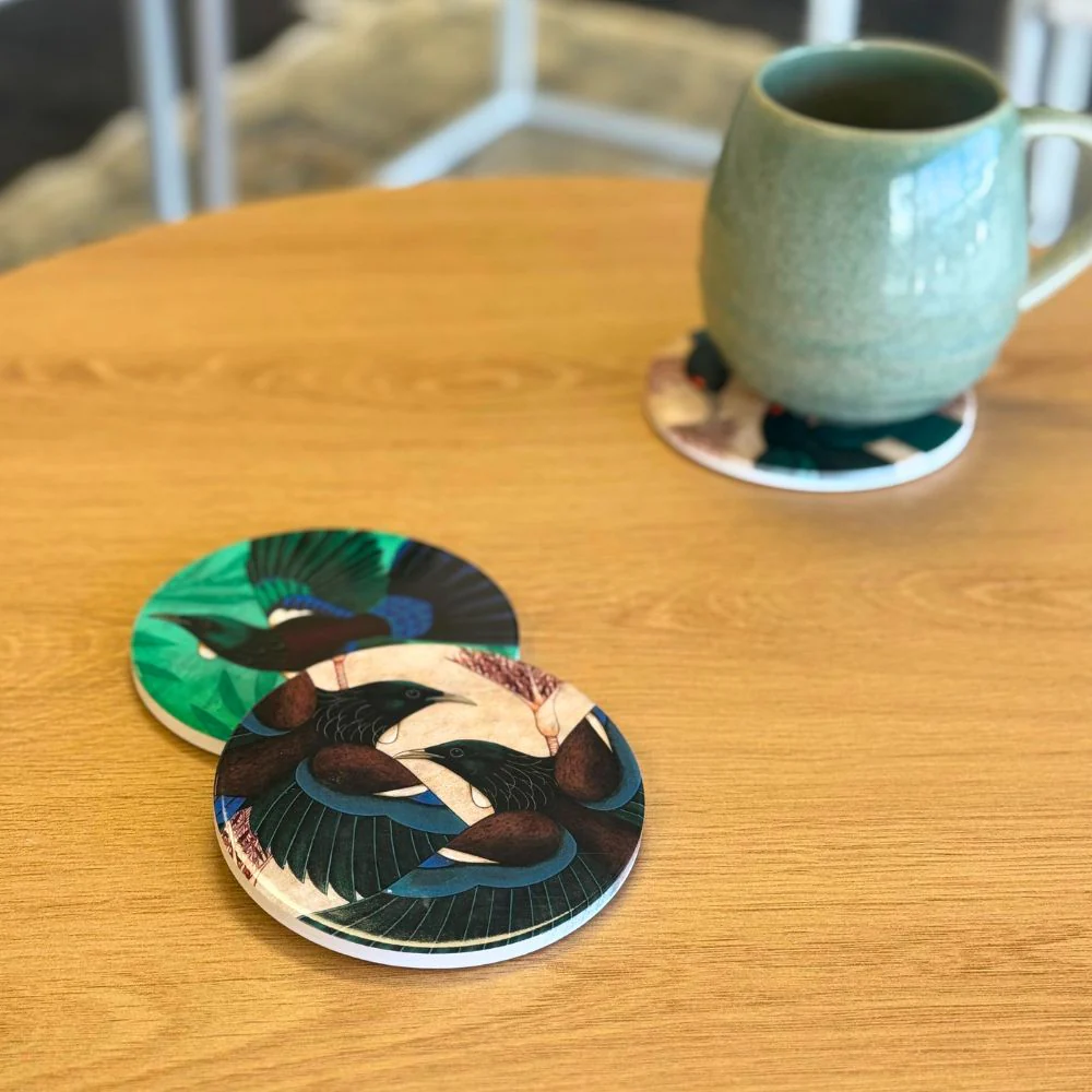 Featuring the NZ native Tūī on a background Nikau.