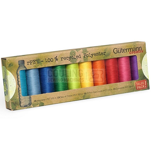 The box set contains 10 bright colours of rPET Sew-All Gutermann thread. These threads are 100% recycled polyester and in keeping with the theme the storage box is also 100% recycled cardboard.