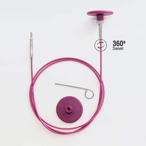 These swivel cables work with all KnitPro needles. These purple coated stainless steel cables are strong and flexible, each is made of the finest grade material. With a 360 degree swivel mechanism these cables are memory-free for no twisting. The connections twist independently of the cable, moving with you as you knit, so your cables don't twist or 'pull' against you. Each cable pack also includes purple coloured end caps and cable keys used for tightening the tips to the cable.