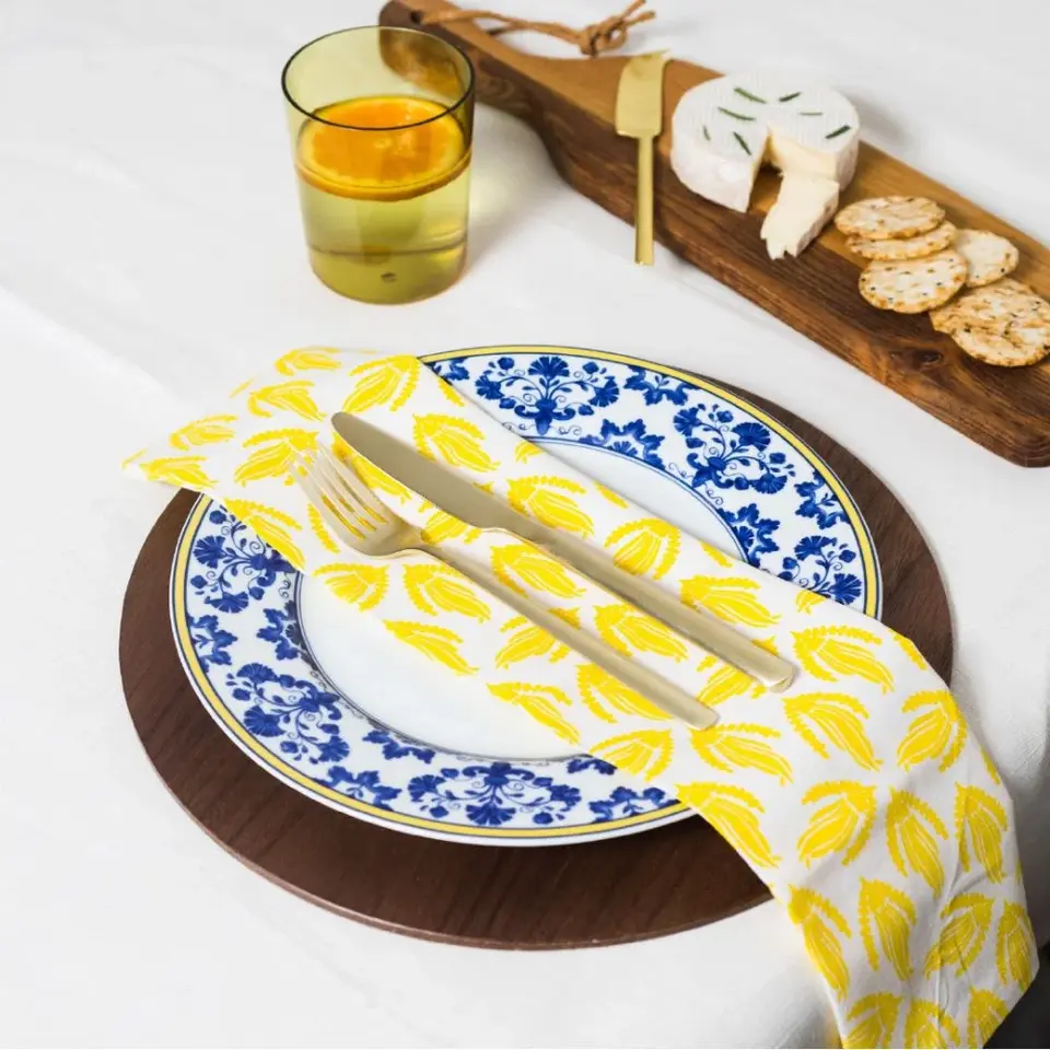 These napkins bring to life the joyous colour and pattern of the kowhai tree, Aotearoa New Zealand’s unofficial national flower. The lace design is a nod to the tradition of garden parties from times past. Woven and printed on 100% GOTS Certified Organic Cotton.