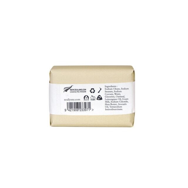 Ingredients: Sodium Oleate, Sodium Stearate, Sodium Cocoate, Water, Glycerine, Oatmeal, Essential Lemongrass Oil, Goats Milk, Sodium Chloride, Shea Butter, Avocado Oil, Tetrasodium Iminodisuccinate.