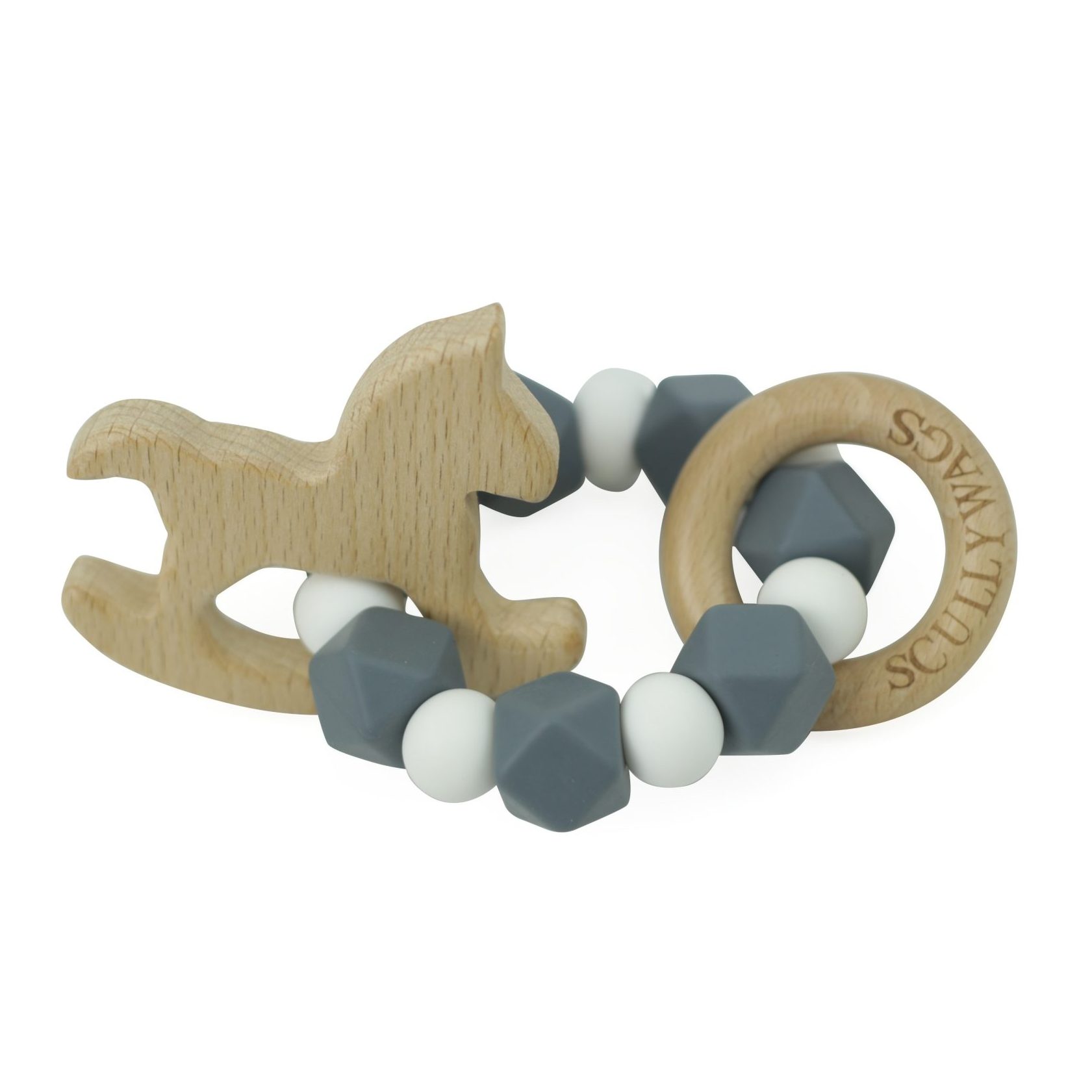 Baby Scullywags Wooden Teether, a natural and safe solution for soothing your baby’s sore gums. This thoughtfully designed teether features soft, chewy silicone beads that provide comfort and relief during teething. The smooth texture of the wooden teething ring and rocking horse shape offers a gentle massage, making it perfect for easing discomfort. Lightweight and easy for little hands to grasp, this teether encourages independent play while ensuring safety with its non-toxic materials. Tested and certified with CPSC (Consumer Product Safety Commission), you can trust that this teether meets the highest safety standards for your little one.