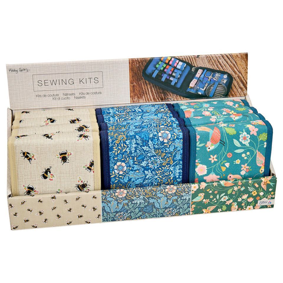 Premium sewing kit presented in a cotton, zippered case. Kit contains: 3 buttons; 10 pearl pins; thimble; needle disc (30pcs); 2 needle threaders; scissors; 6 safety pins; seam ripper; tape measure (150cm) and 18 x thread spools. 3 desgins Bee, Bird, Floral Woodblock