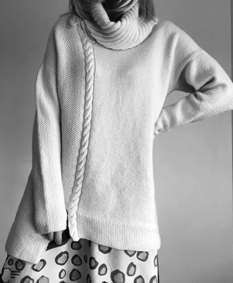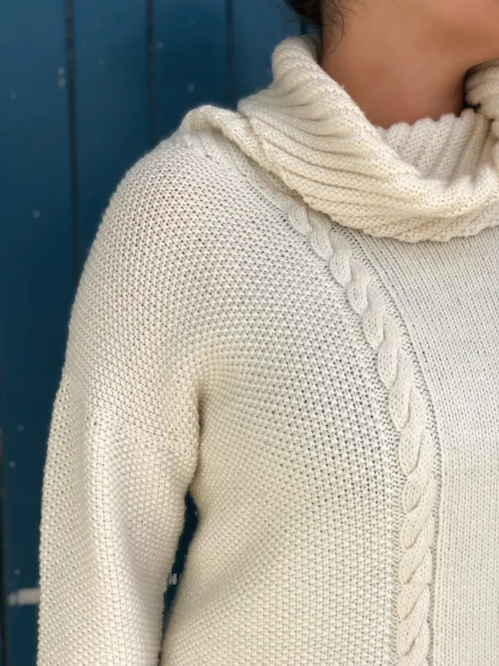 an 8ply/doubleknit jersey with cable and moss stitch detail, gorgeous generous collar and asymmetrical length. The 8ply jumper is worked in pieces on straight needles from the bottom up