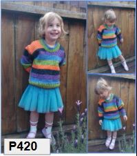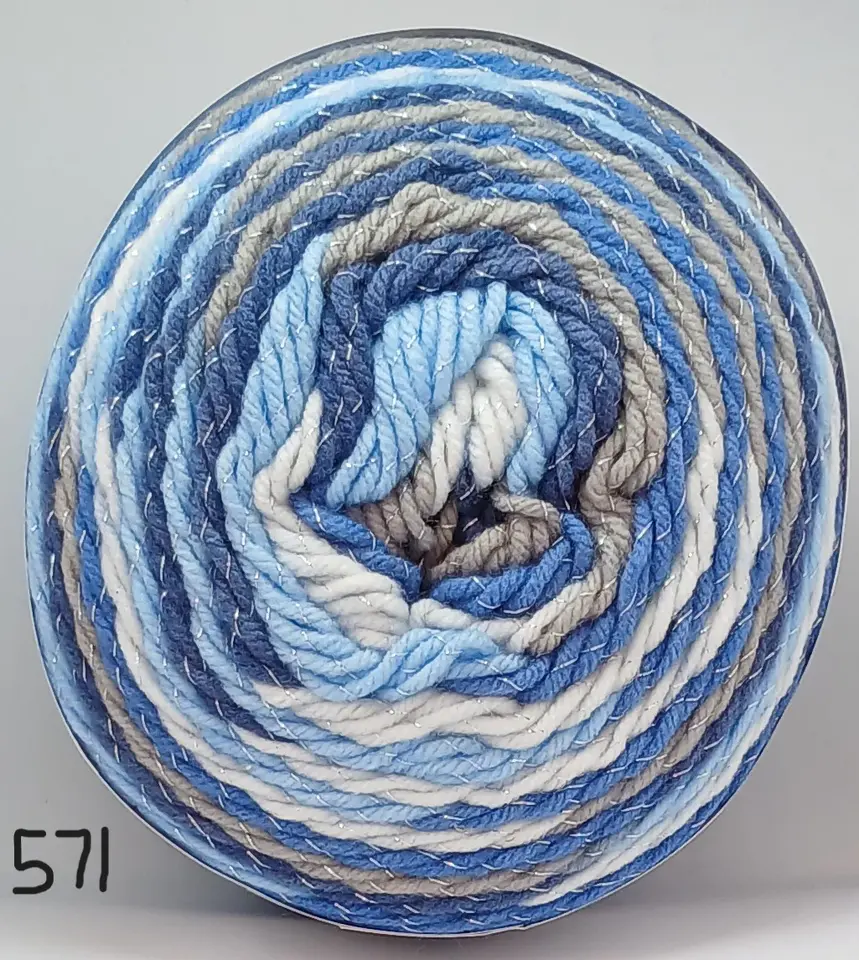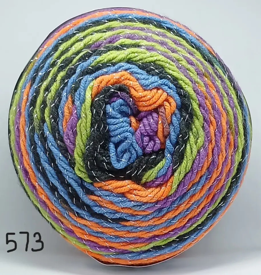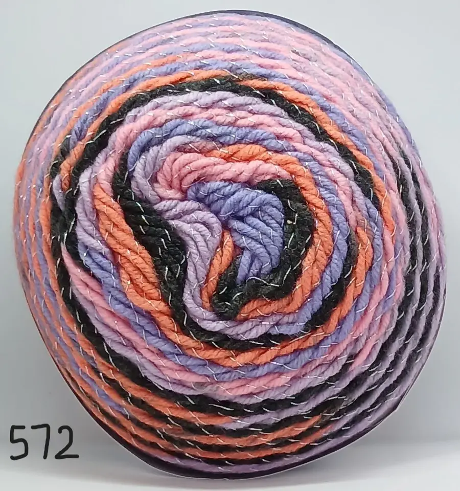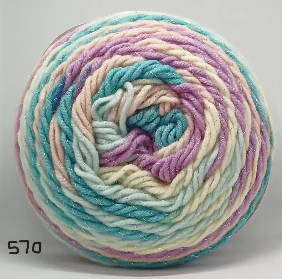 Fun self striping acrylic with a little Sparkle. This yarn is chunky so fast knitting and very economical with 390m on a 200g cake. Create garments and accessories for child or adult that are soft and light to wear.