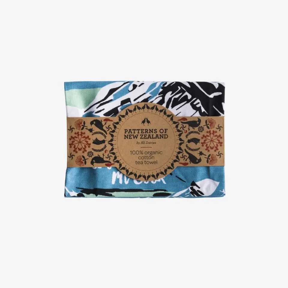 Styled like a New Zealand tourism poster from the 1950s with a subdued colour palate reminiscent of higher alpine experiences. Woven and printed on 100% GOTS Certified Organic Cotton. Beautifully made with a wide hem, mitred corners and a loop for hanging.